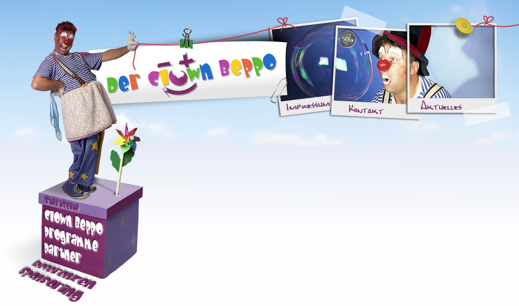 Unter Clown Beppo gibt es als Bildergalerie Lustiges und Neues aus mehr als 30 Jahren Clowntheater, sozusagen die Entwicklung vom bärtigen, ökologisch angehauchten und friedensbewegten 80iger Clown zum professionellen Unterhalter für alle Anlässe.